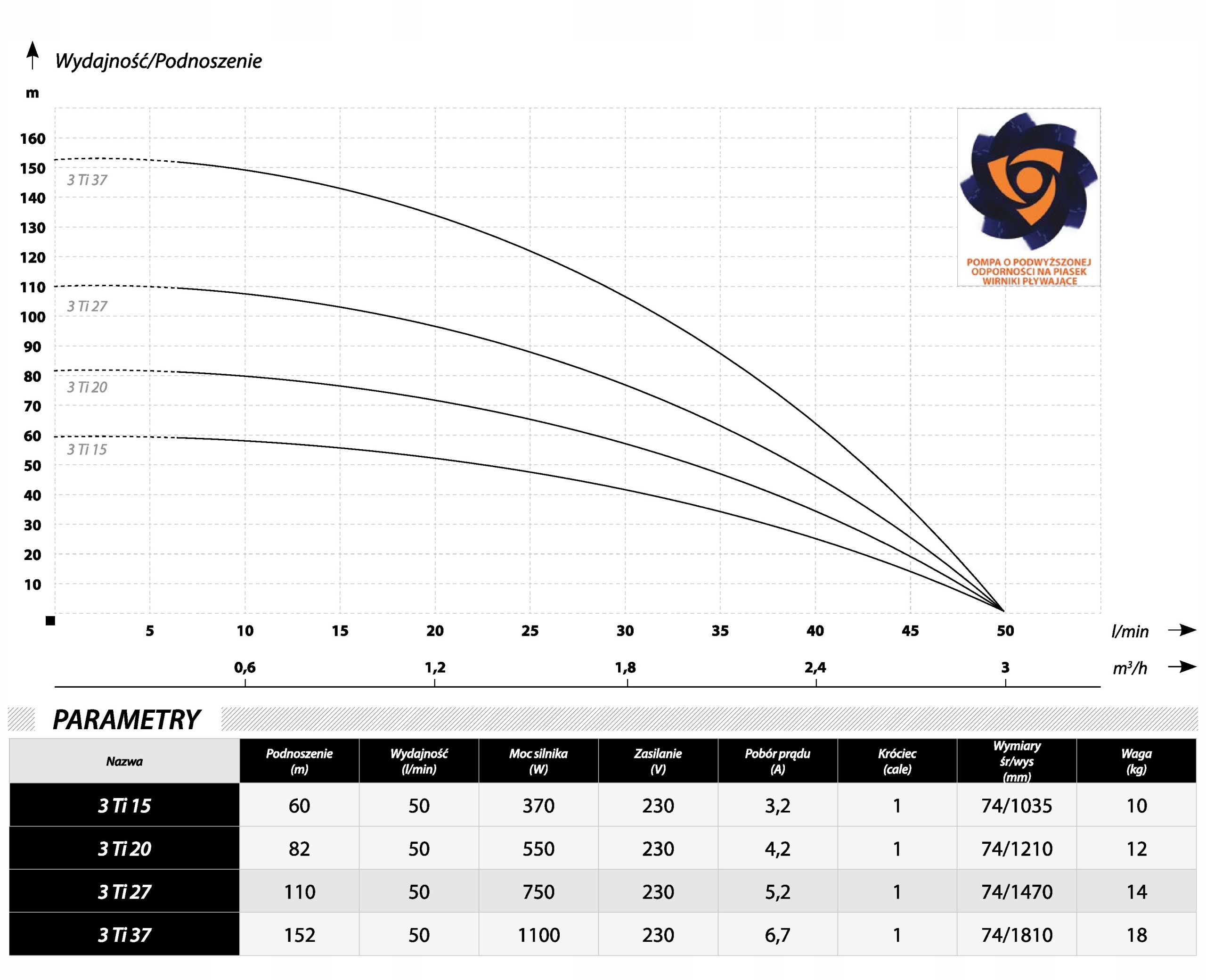 Pompa wyróżnia się niewielkim rozmiarem, pracą ze średnią wydajnością i z wysokim ciśnieniem. Pompuje do 50 l/min, podnosi wodę na wysokość do 110 metrów i osiąga ciśnienie na wyjściu o wartości 8,6 bara. 3-calowa średnica (74 mm) umożliwia na zamontowanie jej w każdym otworze studziennym.