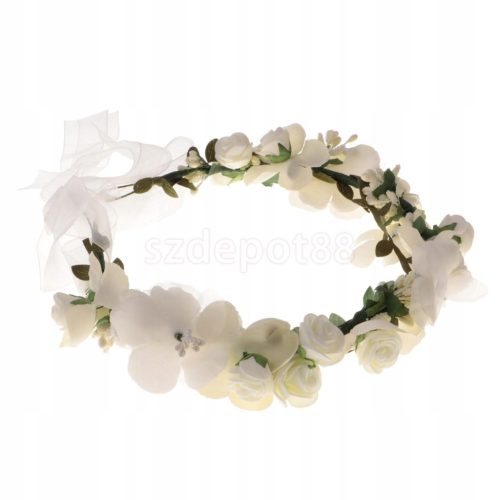 Wianek z dużymi kwiatami w kolorze mleczno białym i drobniejszymi różyczkami ecru oraz zielonymi akcentami prezentuje się naturalnie. Uroku całości dodają organzowe wstążki.
