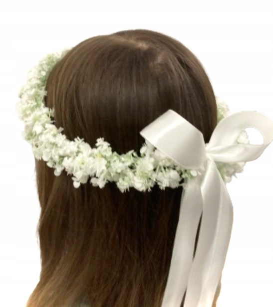 Przedmiotem sprzedaży jest wianek komunijny - polskie rękodzieło, wykonane z najwyższą starannością oraz z dobrej jakości produktów. Model dostępny na tej aukcji jest wykonany ze sztucznych drobniutkich kwiatków przypominających gipsówkę.