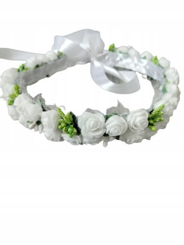 Wykonana z białych różyczek piankowych z tiulem, ale jest przełamana zielonymi akcentami.
