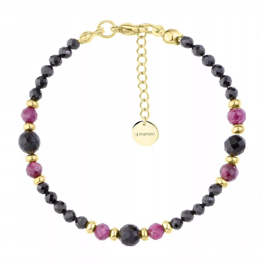 Bransoletka wykonana z fasetowanych kulek czarnego turmalinu oraz różowych rubinów, wykończona złoconymi elementami ze stali szlachetnej.Znakomity dodatek do codziennego ubioru dla kobiet lubiących oryginalną biżuterię. Noś ją samą lub stwórz własną kompozycję z innymi bransoletkami. AMULET OCHRONNYTURMALIN znany jest ze swoich właściwości do oczyszczania i harmonizowania energii, przynosząc spokój i równowagę. Jako kamień słoneczny, przyciąga przyjaźń i inspirację w życiu codziennym. Uważa się, że wzmacnia zdolności intuicyjne i pomaga w rozwijaniu duchowych umiejętności.Rubin to symbol namiętności. Wierzy się, że może wzmacniać więzi emocjonalne i przyciągać miłość do osoby noszącej go. Pomaga w budowaniu pewności siebie, działa pozytywnie na wewnętrzną motywację i wytrzymałość w dążeniu do upragnionego celu.To idealny talizman, który warto mieć zawsze przy sobie.