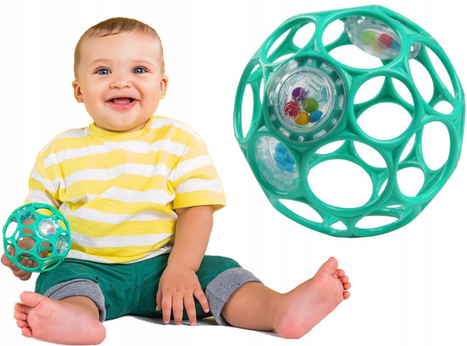 Dzięki grzechotce Oball Twój maluch będzie się świetnie bawił, ucząc się swoich pierwszych umiejętności. Ta wielokrotnie nagradzana grzechotka w kształcie piłki stanie się ulubioną zabawką dziecka. Prosta konstrukcja Oball zapewnia najłatwiejszy chwyt nawet dla najmniejszych rączek, co spodoba się Twojemu maluchowi. Piłka ma 29 otworów, dzięki którym dziecko może ją łatwo chwycić. Piłka jest wykonana z lekkiego materiału, dzięki czemu utrzymają ją małe rączki. W piłce znajdują się trzy grzechotki wypełnione kolorowymi koralikami, które przy najmniejszym potrząśnięciu wydają dźwięki. Dźwięki te zachęcają dziecko do trzymania piłki w rękach i potrząsania nią.