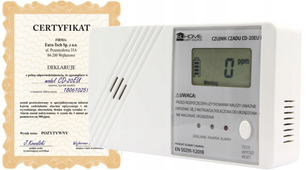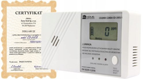 Każdy czujnik czadu posiada certyfikat potwierdzający pozytywny wynik badania w atmosferze z tlenkiem węgla, zawierający indywidualny numer seryjny urządzenia oraz datę i miejsce testu.