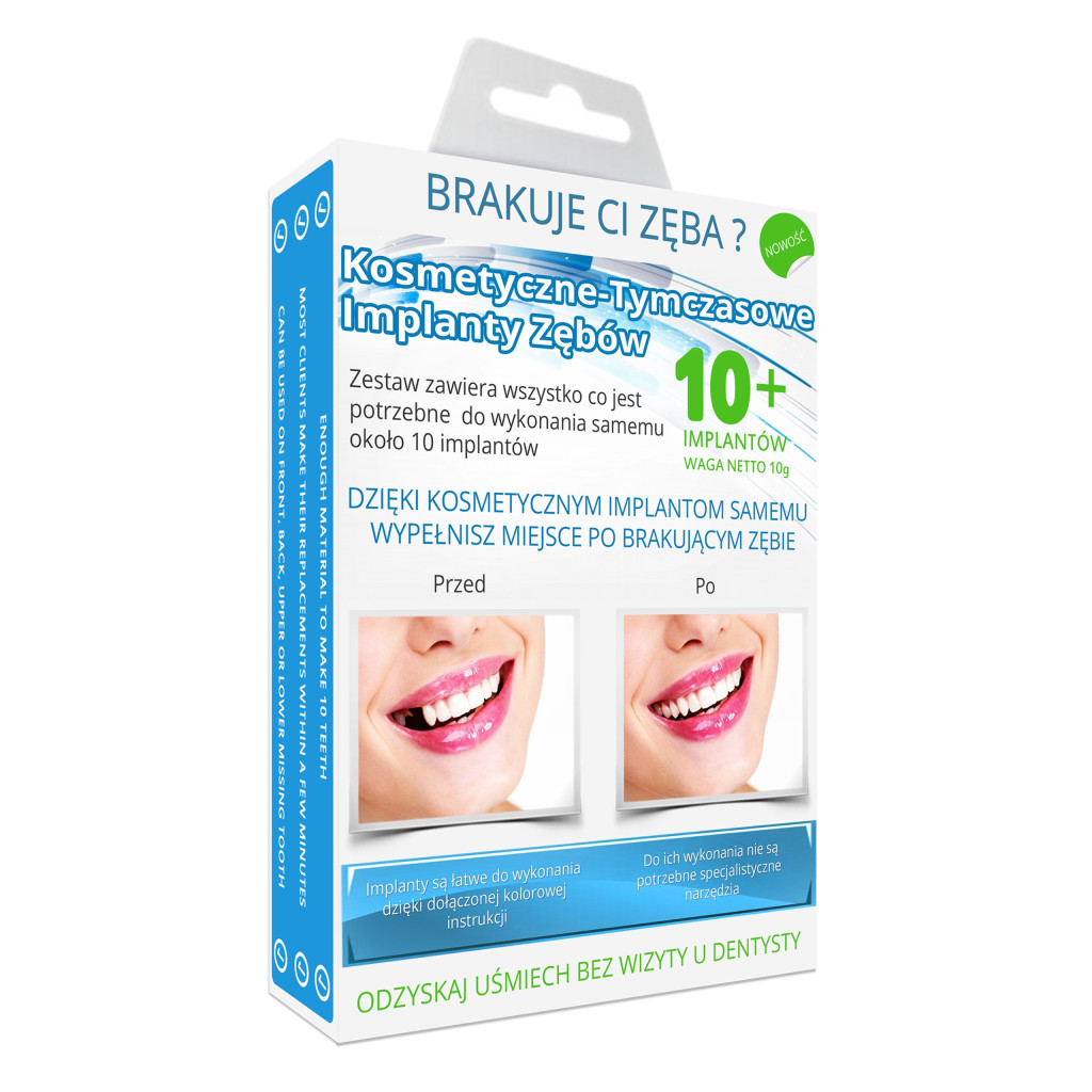 Jeżeli brakuje Ci zęba w wyniku ekstrakcji lub nieszczęśliwego wypadku to napewno zdajesz sobie sprawę jak drogie są implanty dentystyczne oferowane w gabinetach stomatologicznych. Ceny sięgają tysięcy złotych za jeden implant. Niestety nie wszystkich stać na ich zakup. Brakujący ząb może spowodować obniżenie pewności siebie, możesz mieć problemy z uśmiechaniem się i ze swobodą wypowiedzi. Ma to ogromny wpływ na poczucie własnej wartości. Zadaniem tymczasowych implantów zębowych jest dostarczenie taniego i szybkiego sposobu aby zamaskować szparę po brakującym zębie. Jest to sposób dla tych, którzy nie mogą pozwolić sobie na drogie implanty stałe, oferowane w gabinetach stomatologicznych.