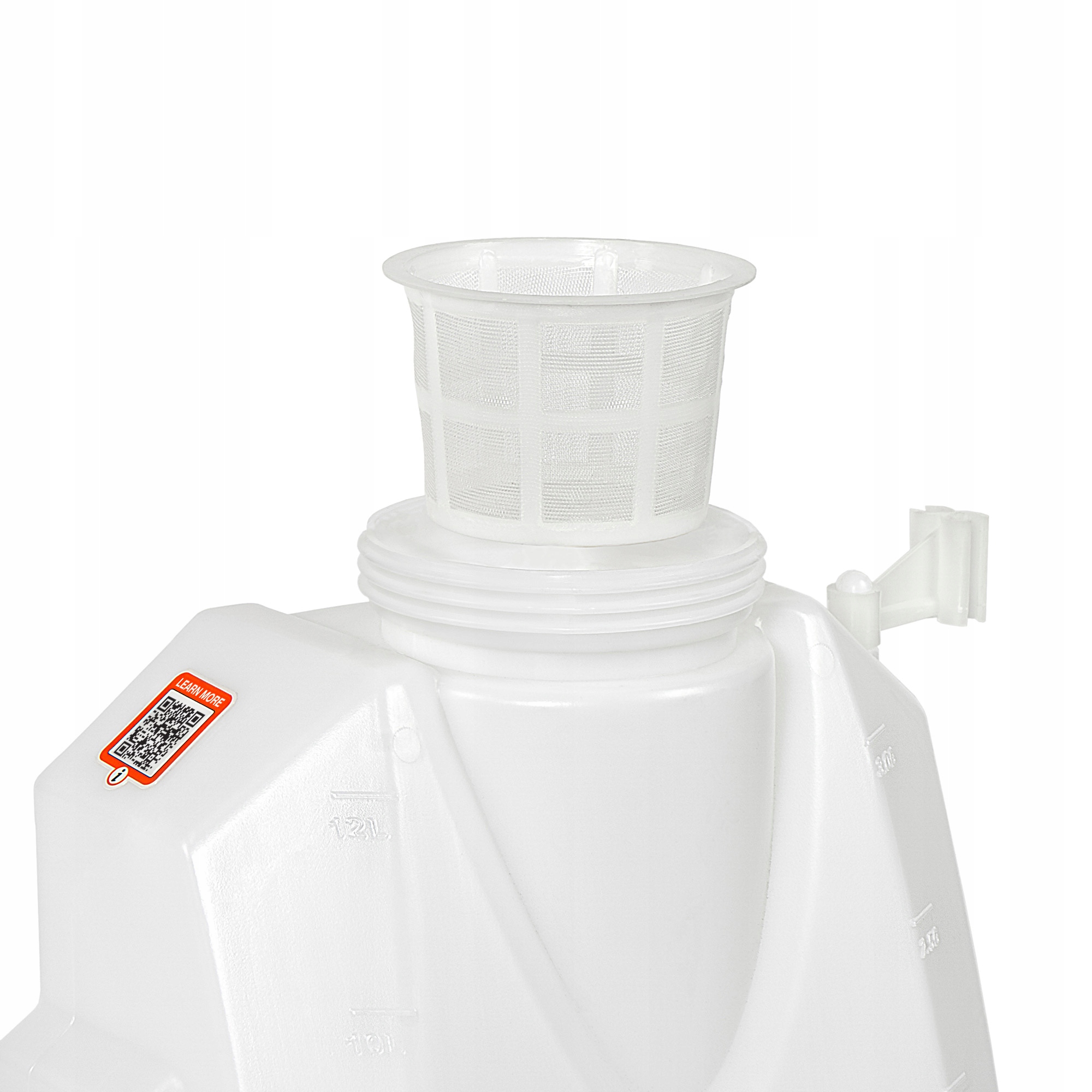Szeroki otwór umożliwia wygodne napełnianie zbiornika, a filtr wstępny zatrzymuje większe cząstki, chroniąc pompę przed awarią.