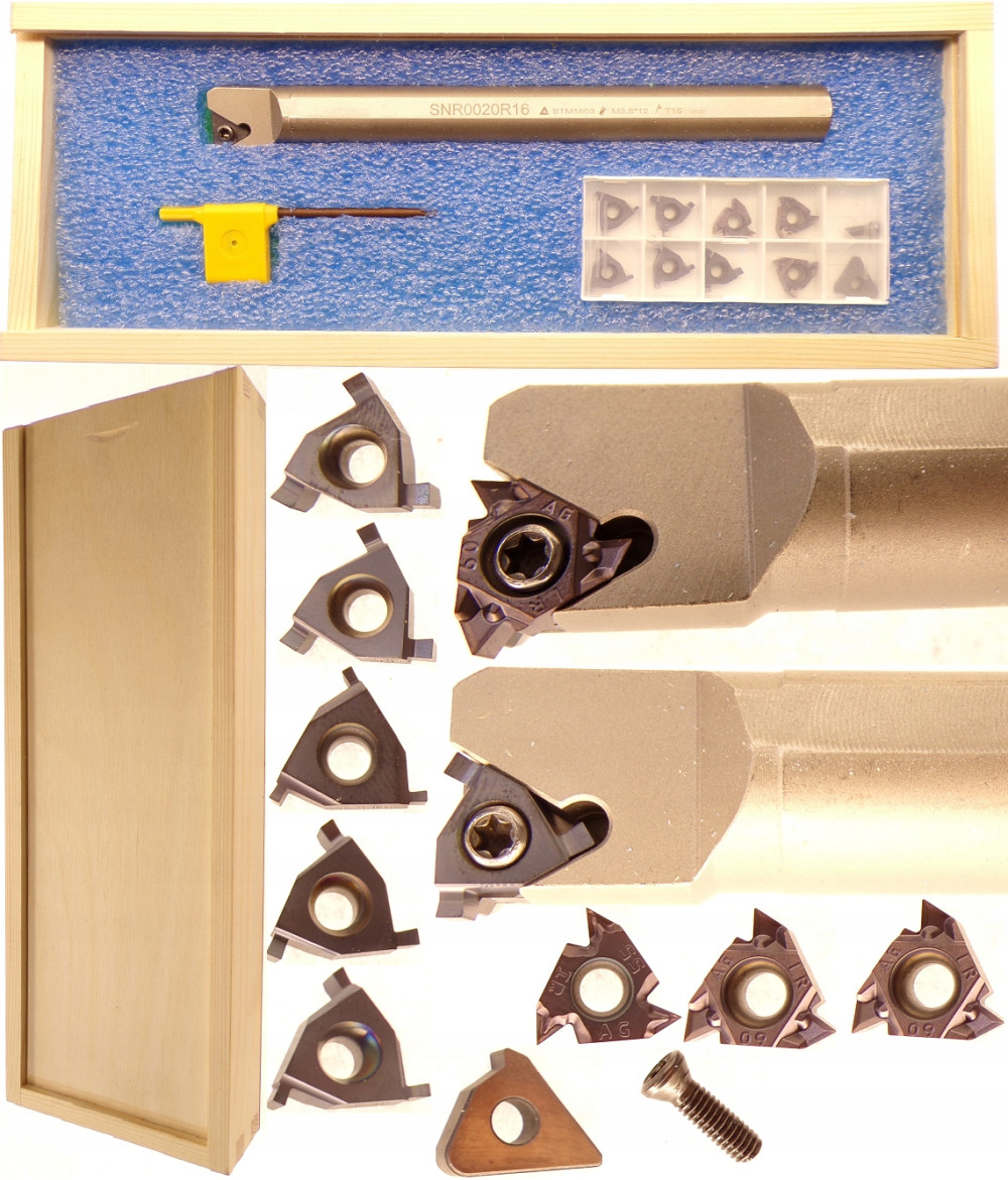 KOMPLET NÓŻ TOKARSKI DO GWINTOWANIA I KANAŁKÓW SNR 0020 R16 + PIĘĆ PŁYTEK DO KANAŁKÓW, TRZY PŁYTKI DO GWINTOWANIA, ZAPASOWA ŚRUBKA, ZAPASOWA PŁYTKA PODPOROWA I KLUCZYK