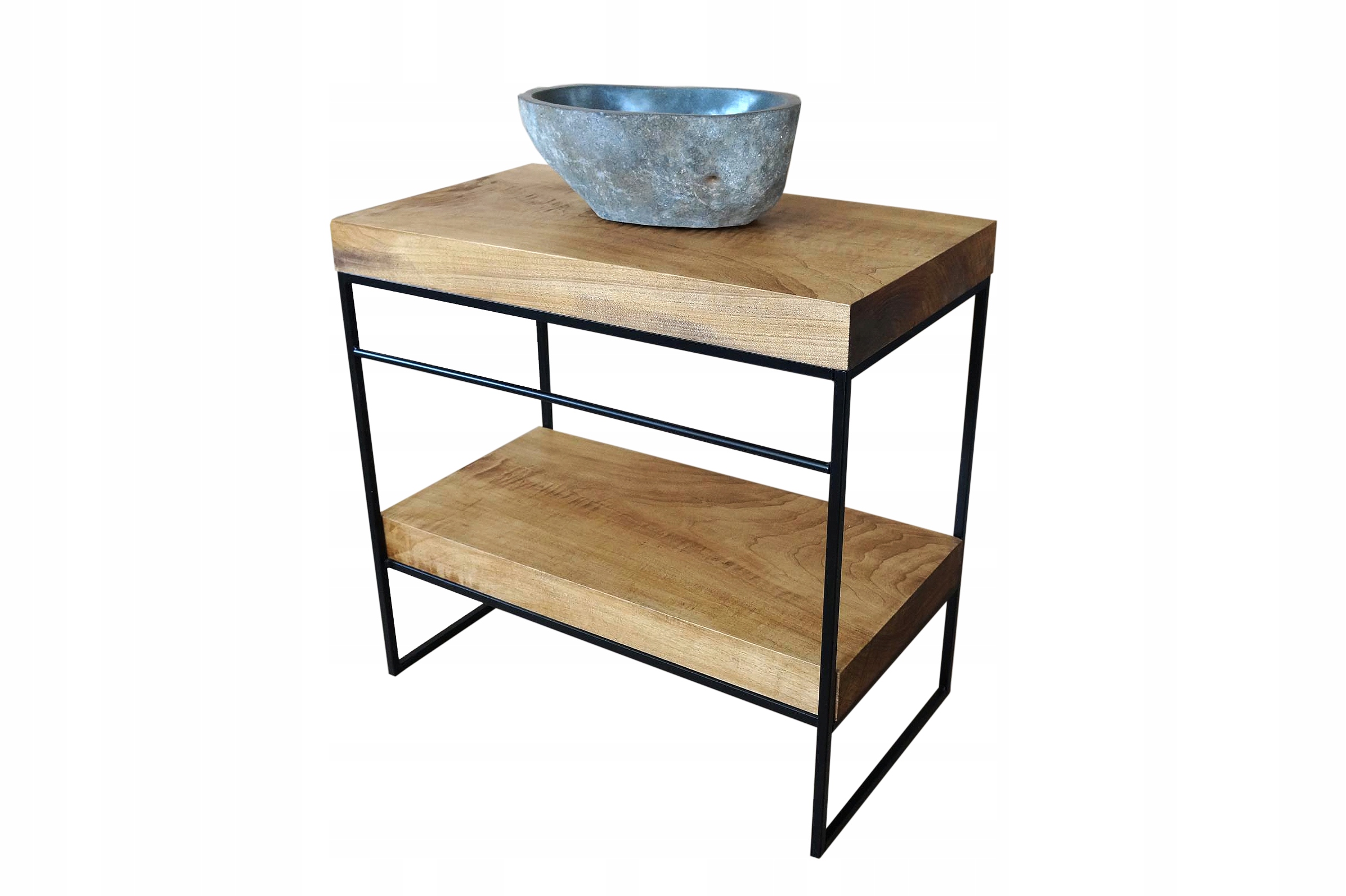 Szafka wykonana z drewna topoli o grubości ok.7 cm. Posiada drążek na ręcznik. Stelaż wykonany z profili stalowych 15x15mm malowany proszkowo na kolor czarny mat (możliwość pomalowania na dowolny kolor). Stelaż spawany. Bardzo solidny.Szafka posiada otwór pod syfon (pasuje każdy standardowy syfon). Blat olejowany.