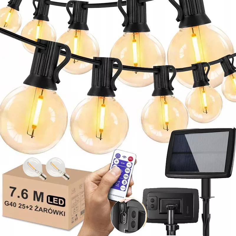 Solarna lampa łańcuchowa zewnętrzna G40 ma 7,6 m długości, 25 sztuk żarówek kulowych.Światła zasilane są energią słoneczną.Żarówki LED o wysokiej wydajności oszczędzają ponad 90% energii w porównaniu z żarówkami.Słoneczne zewnętrzne oświetlenie łańcuchowe automatycznie włącza się w nocy i wyłącza w ciągu dnia.