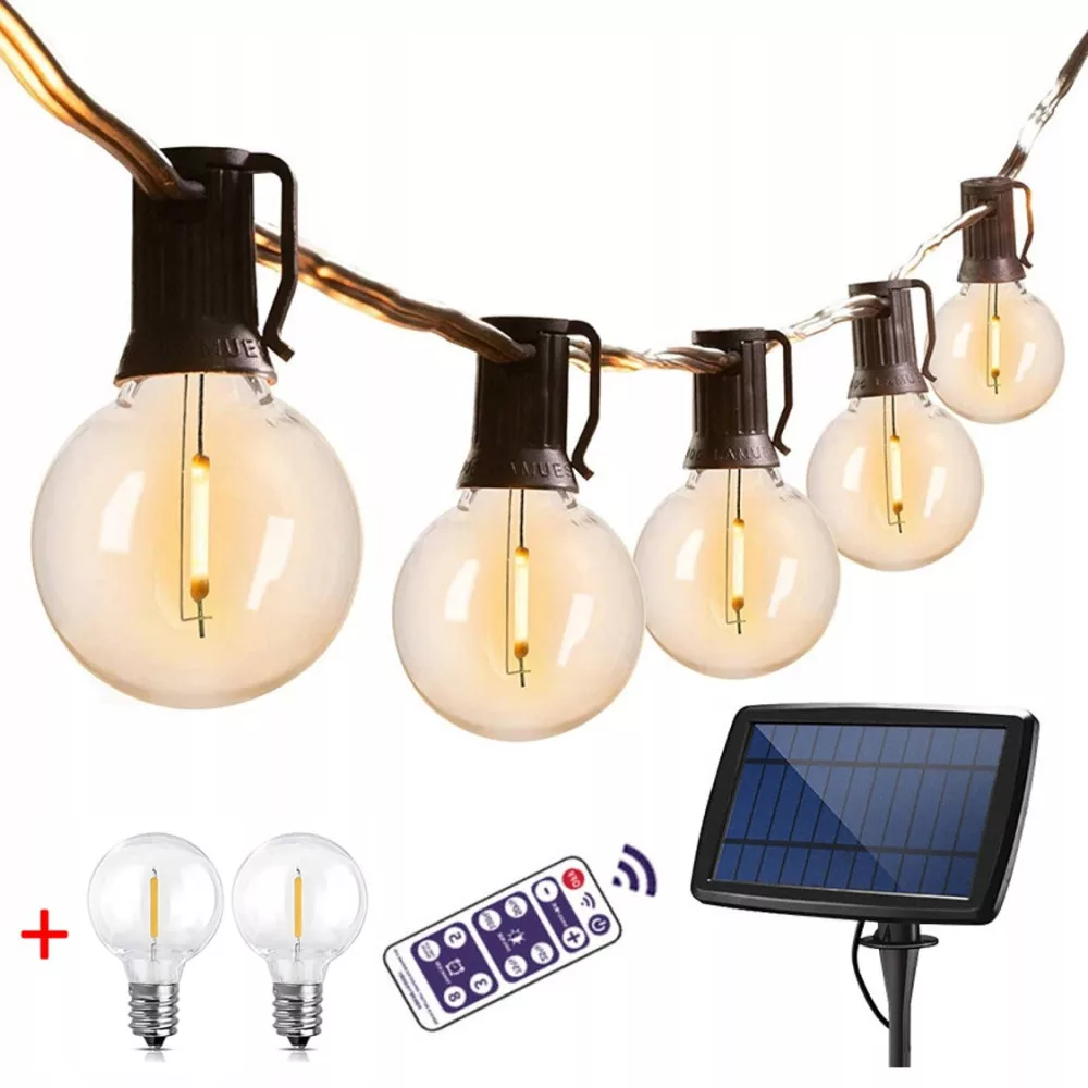 Solarna lampa łańcuchowa zewnętrzna G40 ma 7,6 m długości, 25 sztuk żarówek kulowych.Światła zasilane są energią słoneczną.Żarówki LED o wysokiej wydajności oszczędzają ponad 90% energii w porównaniu z żarówkami.Słoneczne zewnętrzne oświetlenie łańcuchowe automatycznie włącza się w nocy i wyłącza w ciągu dnia.Ładowanie USB może być uzupełnieniem, gdy w ciągu dnia nie ma wystarczającej ilości światła słonecznego.