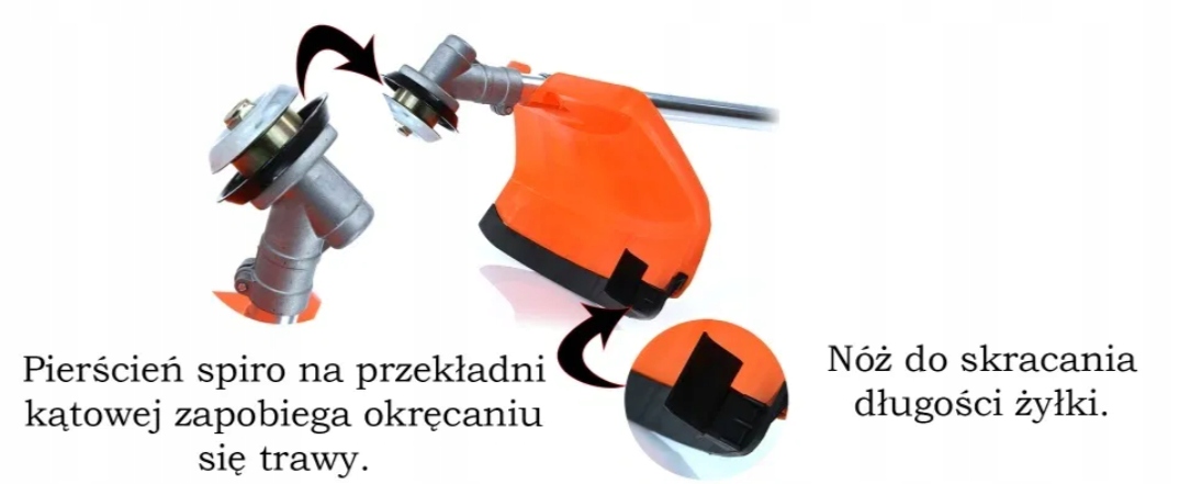 Pierścień spiro na przekładni kątowej zapobiega okręcaniu się trawy. Osłona wyposażona została również w nóż do skracania długości żyłki.