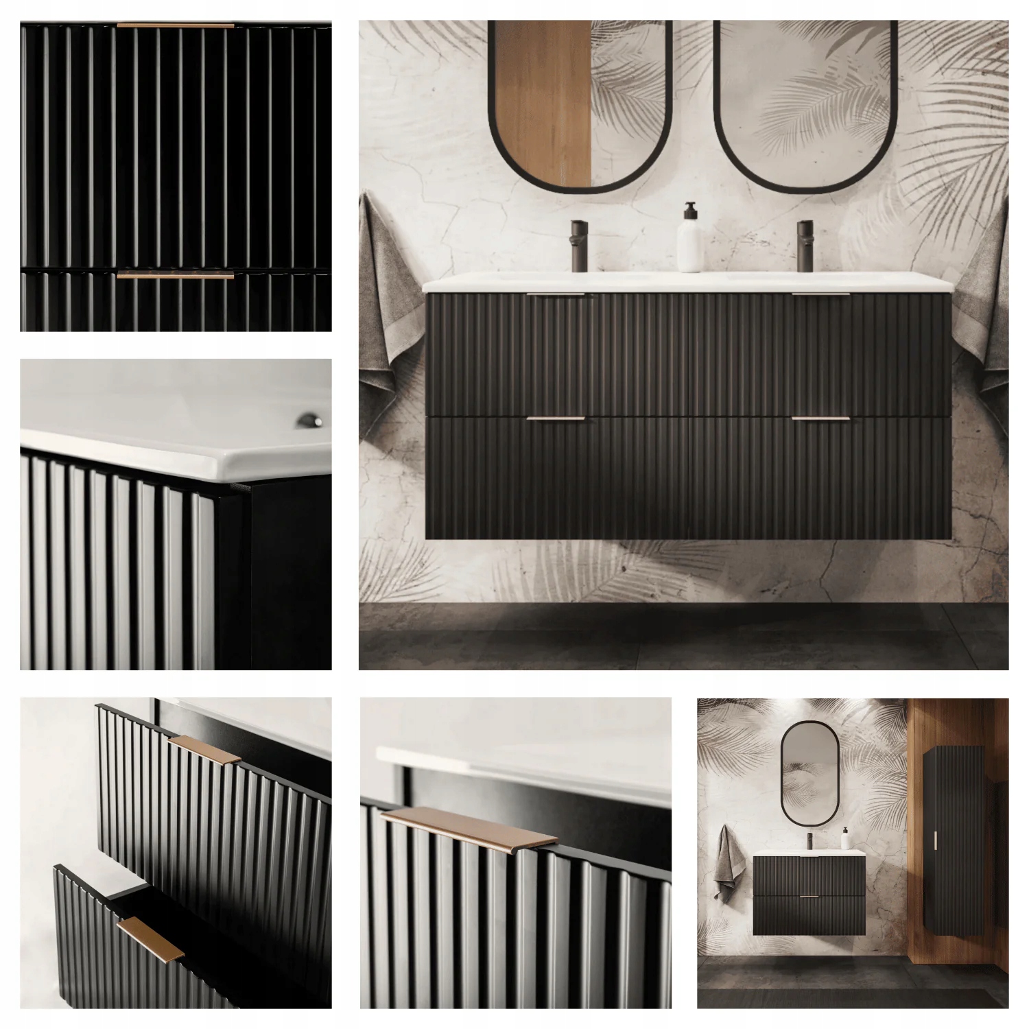 Kolekcja FLOW w czarnej wersji to połączenie klasycznych proporcji brył z unikalnymi, pionowo frezowanymi frontami. Dzięki temu zestawieniu meble z tej linii są uniwersalne i doskonale sprawdzają się zarówno w nowoczesnych, jak i tradycyjnych wnętrzach, a ich wysoka funkcjonalność zapewnia komfort nawet najbardziej wymagającym użytkownikom. Kolekcja obejmuje wiszące szafki pod umywalki w rozmiarach 60 cm i 80 cm w wersjach z szufladami lub z drzwiczkami, szafka podblatowa 40 cm, wysoki słupek, regał podblatowy 20 cm oraz blaty w rozmiarach 60 cm, 80 cm, 100 cm, 120 cm, 140 cm, 160 cm i 180 cm co umożliwia tworzenie przeróżnych zestawów . Dodatkową zaletą jest możliwość wyboru koloru uchwytów – w zestawie znajdują się dwie opcje: złoty oraz czarny. Dzięki temu można łatwo dopasować uchwyty do armatury, luster o różnych kolorach ram, a także w przyszłości odmienić wygląd mebli.