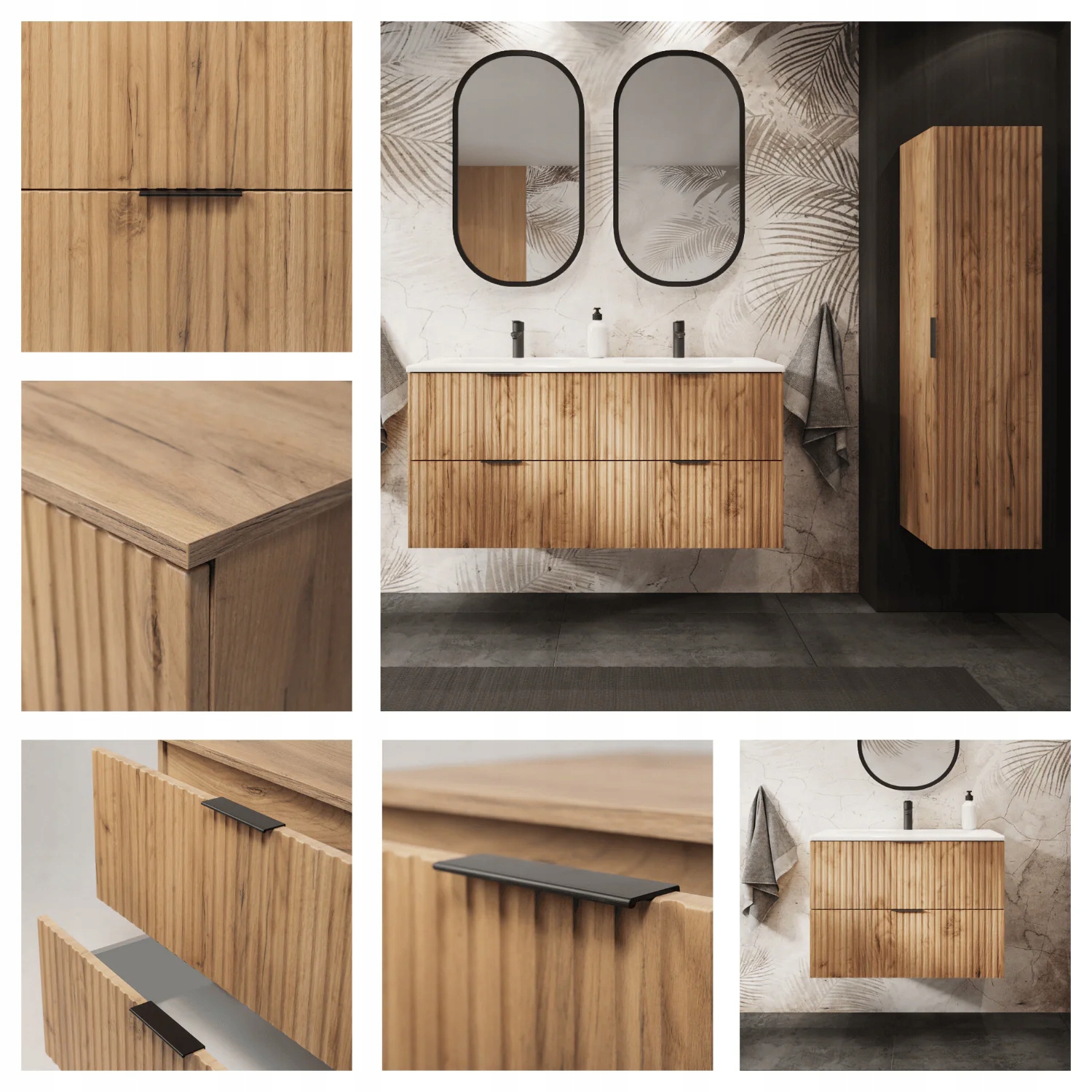 Kolekcja FLOW w nowej, dębowej wersji to połączenie klasycznych proporcji brył z unikalnymi, pionowo frezowanymi frontami. Dzięki temu zestawieniu meble z tej linii są uniwersalne i doskonale sprawdzają się zarówno w nowoczesnych, jak i tradycyjnych wnętrzach, a ich wysoka funkcjonalność zapewnia komfort nawet najbardziej wymagającym użytkownikom. Kolekcja obejmuje wiszące szafki pod umywalki w rozmiarach 60 cm i 80 cm, wysoki słupek, regał podblatowy 20 cm oraz blaty w rozmiarach 60 cm, 80 cm, 100 cm, 120 cm, 140 cm, 160 cm i 180 cm co umożliwia tworzenie przeróżnych zestawów . Dodatkową zaletą jest możliwość wyboru koloru uchwytów – w zestawie znajdują się dwie opcje: złoty oraz czarny. Dzięki temu można łatwo dopasować uchwyty do armatury, luster o różnych kolorach ram, a także w przyszłości odmienić wygląd mebli.