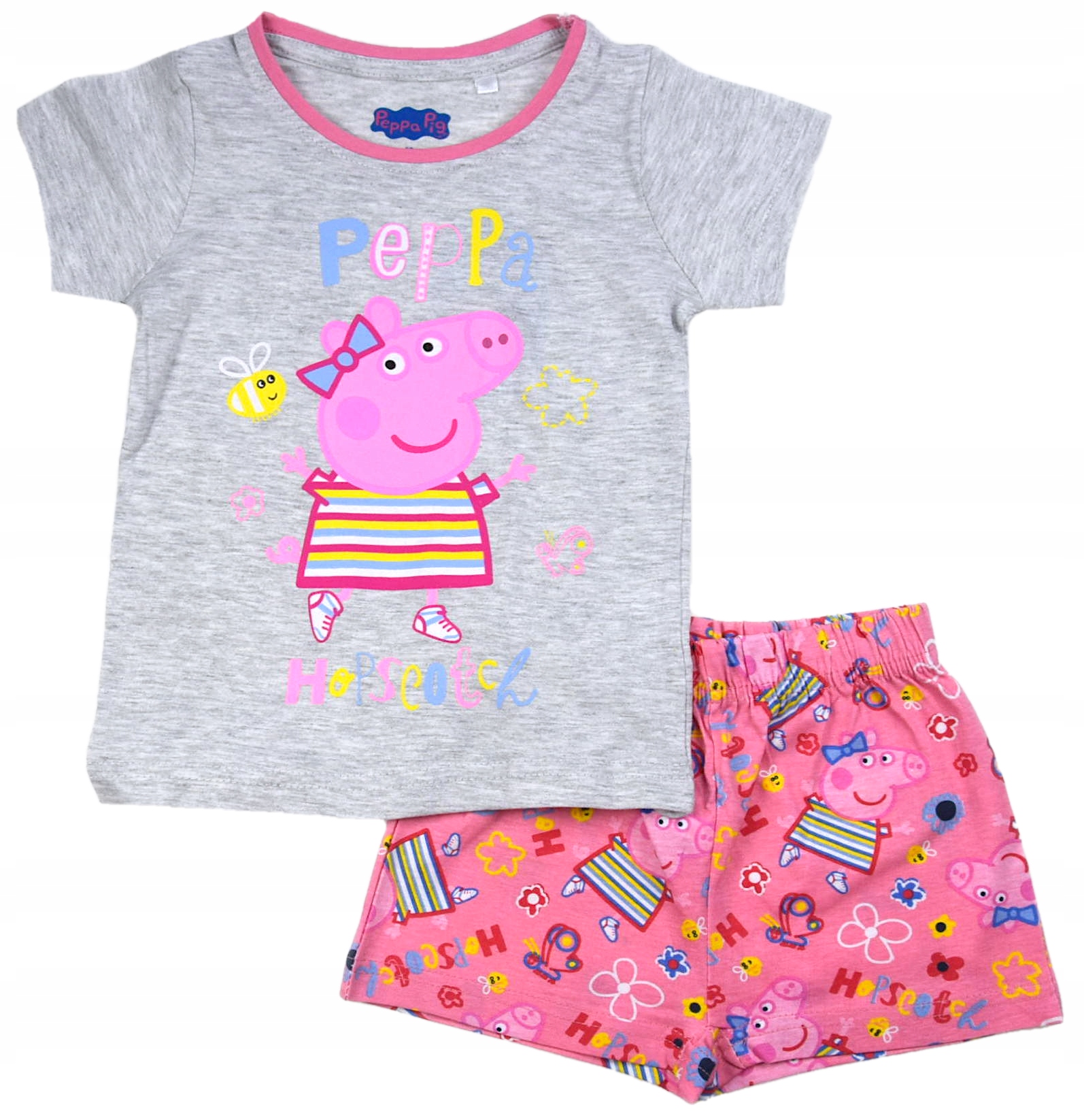 Bawełniana dziewczęca piżamka z aplikacją z ulubionej bajki -Świnka Peppa. Miła, delikatna w dotyku, luźna i nie krępująca ruchów, wygodna do spania. Aplikacja z przodu na bluzce. Spodenki w nadruki, z gumką w pasie.