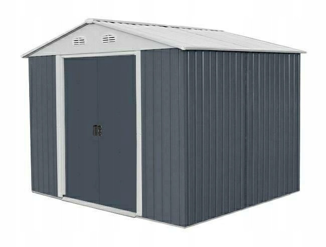 Praktyczny domek ogrodowy do przechowywania narzędzi, urządzeń ogrodowych wykonany z blachy powlekanej. Kratki wentylacyjne zapewniają wentylację, i zapobiegają gromadzeniu sie wilgoci. O 20% grubszy materiał niż o konkurencji co zapewnia wysoką trwałość i odporność. rozmiar - 208x 258 x 260cm, rozmiar podstawy: 248 x 248 x 208cm, grubość blachy - 0,3 mm, grubość ramy - 0,6 mm, wysokość drzwi - 173 cm. Kolor: Ciemnoszary Uwaga: kolor drzwi jest losowy (białe lub szare)