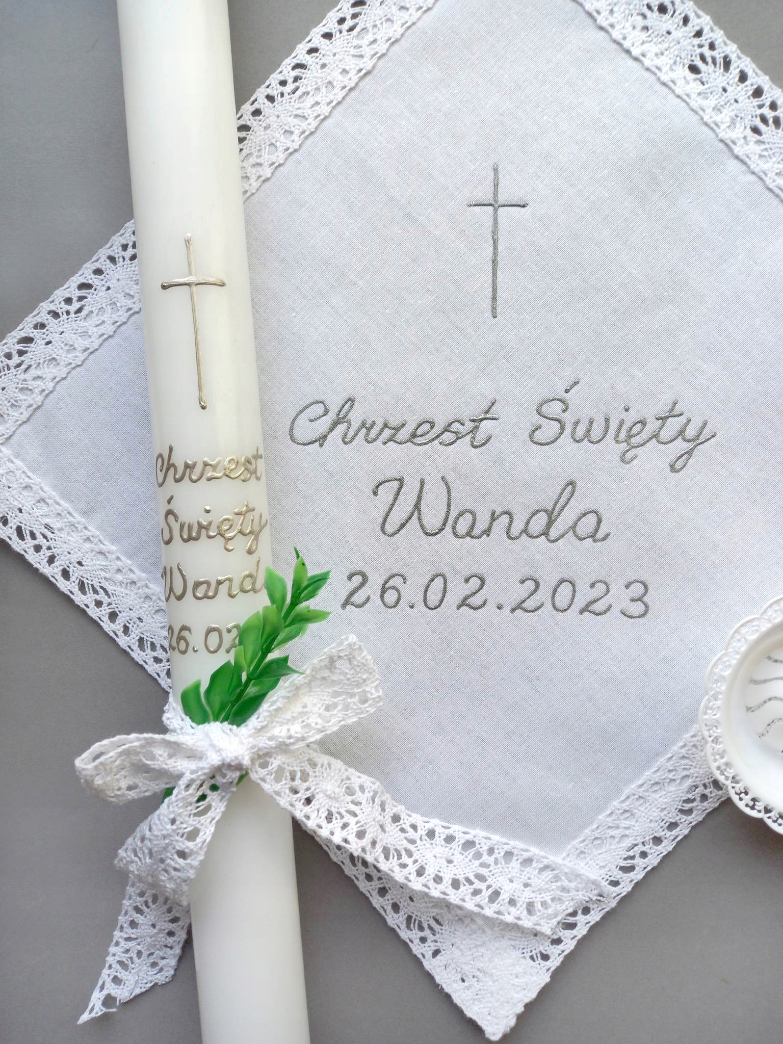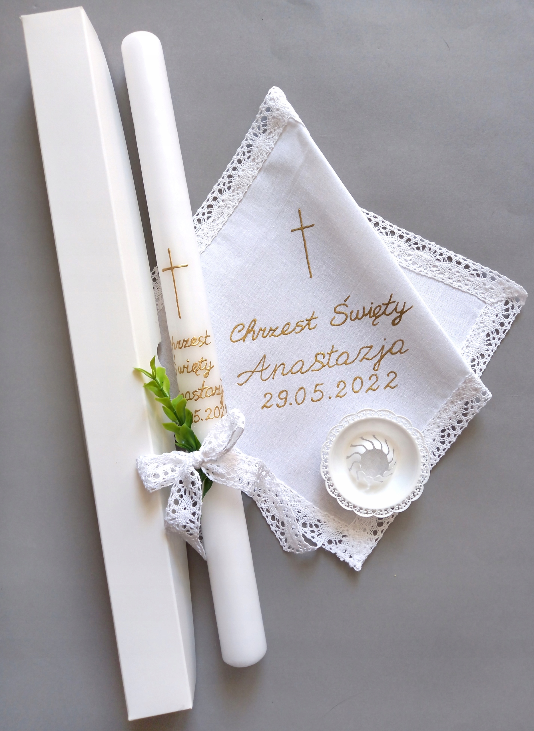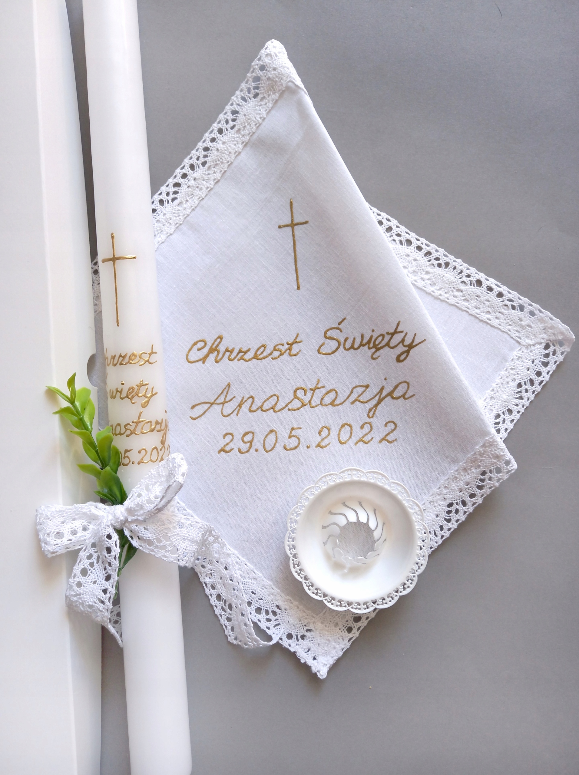 W skład zestawu do chrztu wchodzi świeca i szatka do chrztu z