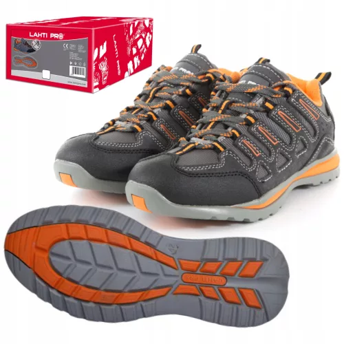 Buty z najnowszej kolekcji LahtiPro. Wierzch obuwia wykonany ze skóry nubukowej oraz dzianiny siatkowej. Podszewka wykonana z dzianiny siatkowej. Wyściółka wymienna. Buty nie posiadają elementów metalowych oraz nie mają podnoska. Podeszwa gumowa o nowoczesnej linii wzorniczej oraz głęboki protektor zapewniają wysoką stabilność obuwia podczas chodzenia. Obuwie posiada certyfikat CE oraz normę ISO 20347:2011. Buty posiadają kategorię bezpieczeństwa OB FO która mówi o tym że obuwie posiada podeszwę odporną na olej napędowy jak również odporność na poślizg na podłożu ceramicznym pokrytym roztworem laurylosiarczanu sodu (SLS).