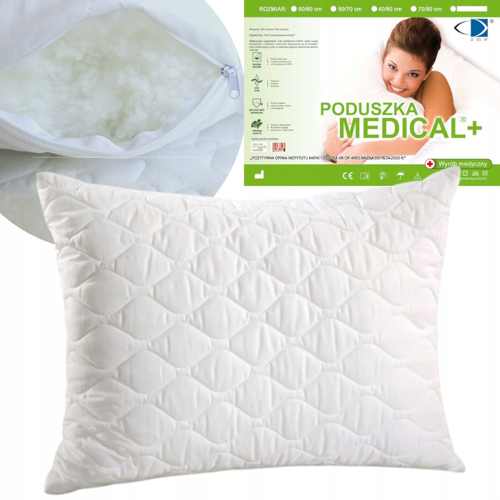 Poduszka antyalergiczna Medical jest lekka i przewiewna. Poszycie poduszki jest w kolorze białym. Zostało wykonane z policottonu. Jest to tkanina w której połączono zalety bawełny z wytrzymałością poliestru. Poduszki z tej linii są trwałe i wytrzymują pranie w temperaturze 95°C. Tkanina zapewnia odpowiedni przepływ powietrza i doskonale odprowadza nadmiar zgromadzonego ciepła.
