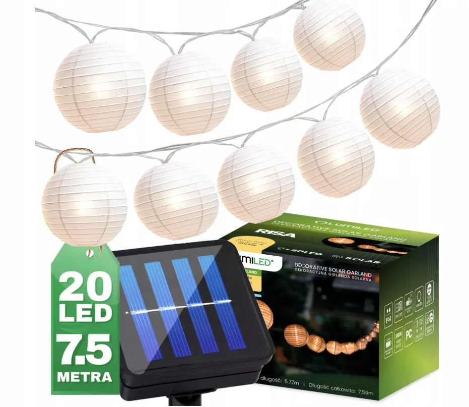 Girlanda łańcuch solarny RISA z dwudziestoma składanymi kulkami w kolorze białym marki Lumiled. Girlanda solarna to dekoracyjne, praktyczne i przyjazne oświetlenie Twojego ogrodu i środowiska.