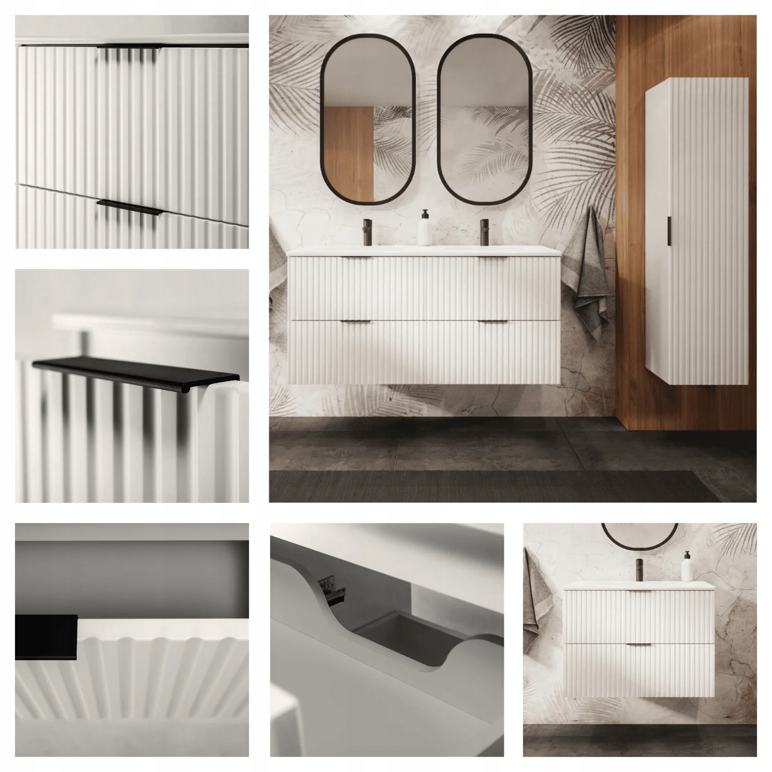 Kolekcja FLOW w klasycznej bieli to połączenie klasycznych proporcji brył z unikalnymi, pionowo frezowanymi frontami. Dzięki temu zestawieniu meble z tej linii są uniwersalne i doskonale sprawdzają się zarówno w nowoczesnych, jak i tradycyjnych wnętrzach, a ich wysoka funkcjonalność zapewnia komfort nawet najbardziej wymagającym użytkownikom. Kolekcja obejmuje wiszące szafki pod umywalki w rozmiarach 60 cm i 80 cm w wersjach z szufladami lub z drzwiczkami, szafka podblatowa 40 cm, wysoki słupek, regał podblatowy 20 cm oraz blaty w rozmiarach 60 cm, 80 cm, 100 cm, 120 cm, 140 cm, 160 cm i 180 cm co umożliwia tworzenie przeróżnych zestawów . Dodatkową zaletą jest możliwość wyboru koloru uchwytów – w zestawie znajdują się dwie opcje: złoty oraz czarny. Dzięki temu można łatwo dopasować uchwyty do armatury, luster o różnych kolorach ram, a także w przyszłości odmienić wygląd mebli.