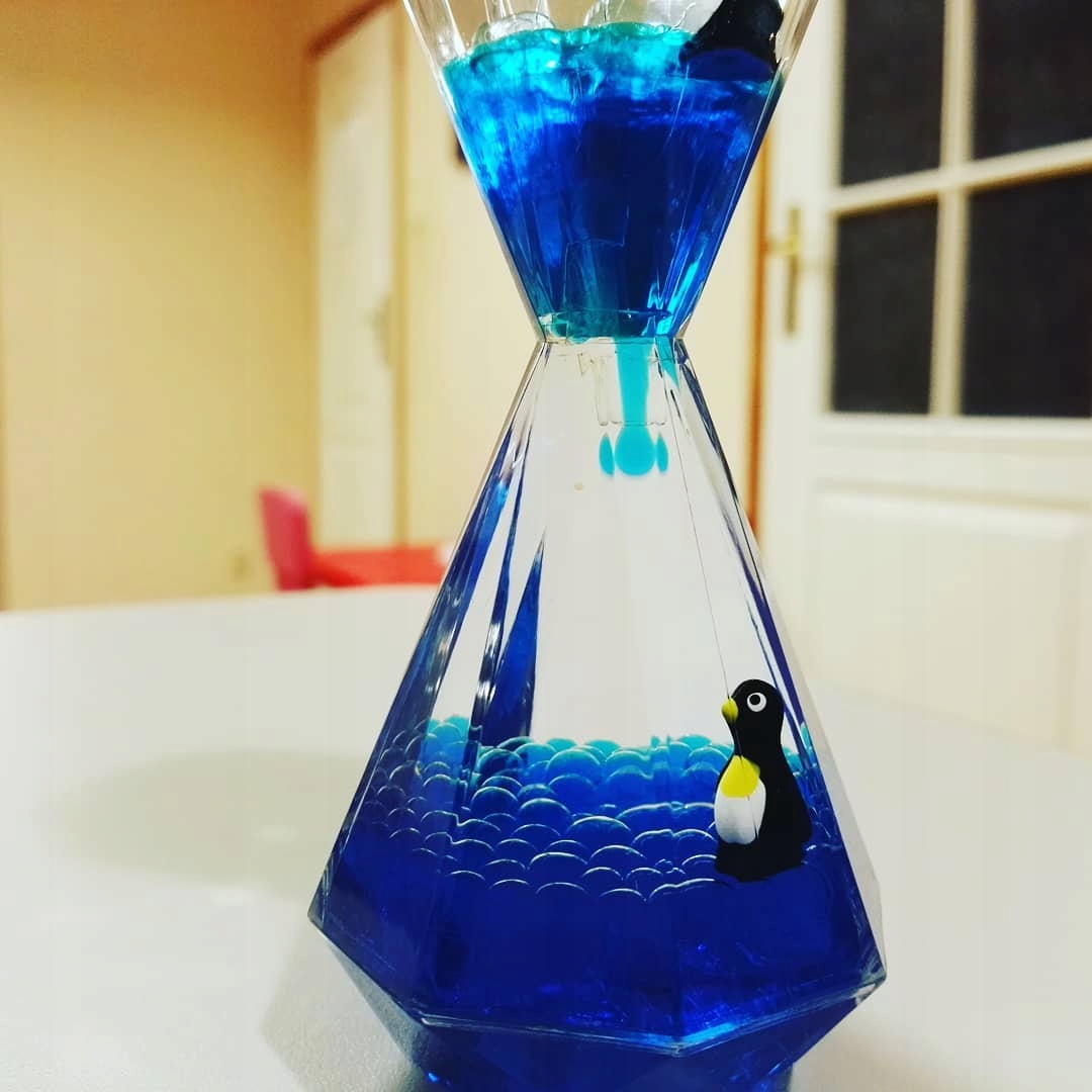 Dzięki przezroczystej obudowie w kształcie kryształu klepsydra tworzy ciekawe efekty świetle i iluzje wzrokowe. W obu komorach klepsydry znajdują się niewielkie pingwinki. W czasie przelewania się płynu jeden pingwinek zaczyna się wynurzać, a drugi w tym samym czasie powoli tonąć.