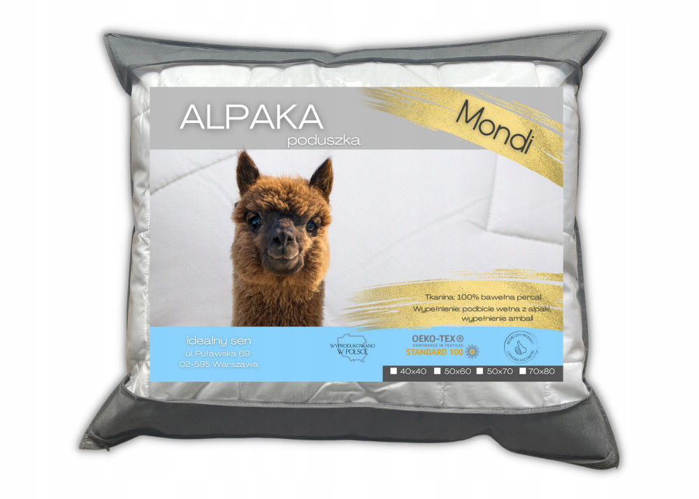 Kolekcja Mondi Alpaka cechuje się najlepszą jakością wykonania premium. Poduszka posiada 100% podbicie z wełny Alpak, została wypełniona włóknami Amball, a poszycie wykonano z najlepszej jakości bawełny typu percal. Ekskluzywne włókno z runa Alpaki jest mocniejsze od wełny owczej, a przy tym cieńsze. Surowiec jest sześć razy cieplejszy od włókien z owczej wełny. Włókno się nie rwie, jest odporne na deformacje, dlatego jego trwałość jest niesamowita!