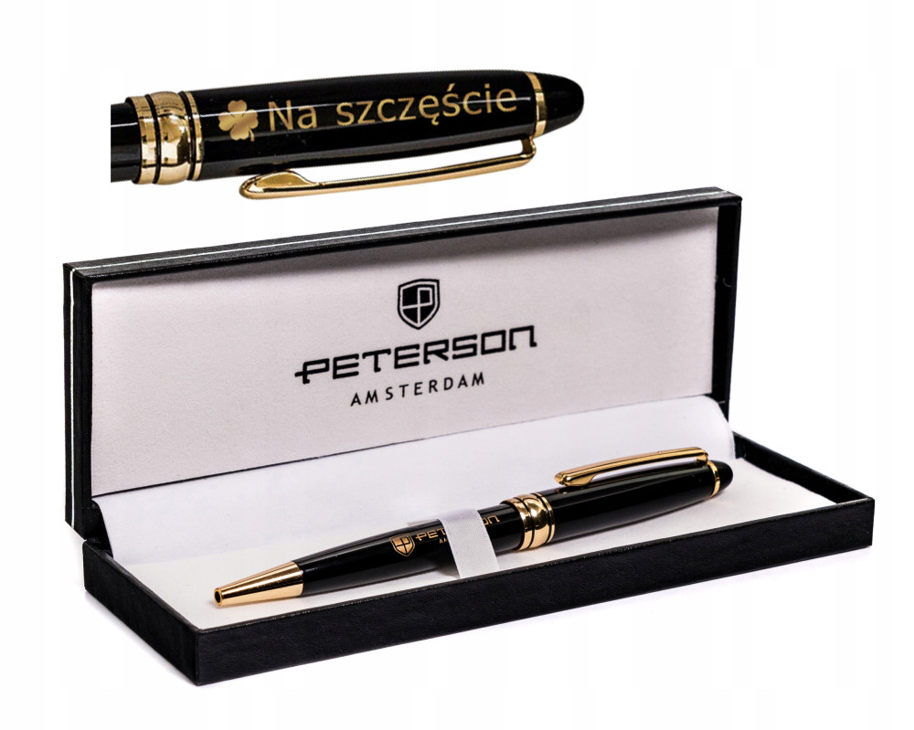 Długopis z jednostronnym grawerem logo marki PETERSON® w dominującym czarnym kolorze. Całość dopełniają pierścienie ze stali nierdzewnej w stylowym, złotym kolorze. Ergonomiczny kształt i waga dopasowane są do Twojej dłoni, zapewniając idealny uchwyt i równowagę.