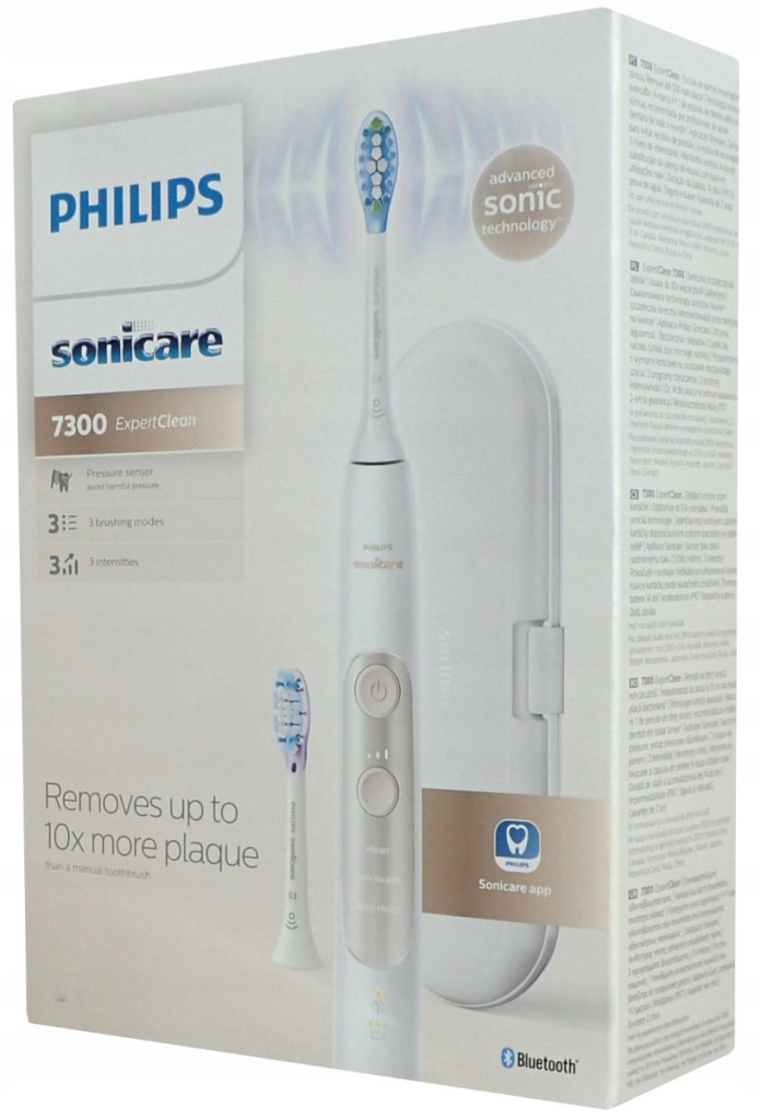 Philips Sonicare ExpertClean 7300 HX9601/03 to szczoteczka soniczna posiadająca 3 programy czyszczenia i 3 poziomy intensywności, czujnik siły nacisku oraz technologię BrushSync, która informuje o wymianie końcówki szczoteczki. Czujnik siły nacisku informuje przez wibracje o zbyt silnym szczotkowaniu.