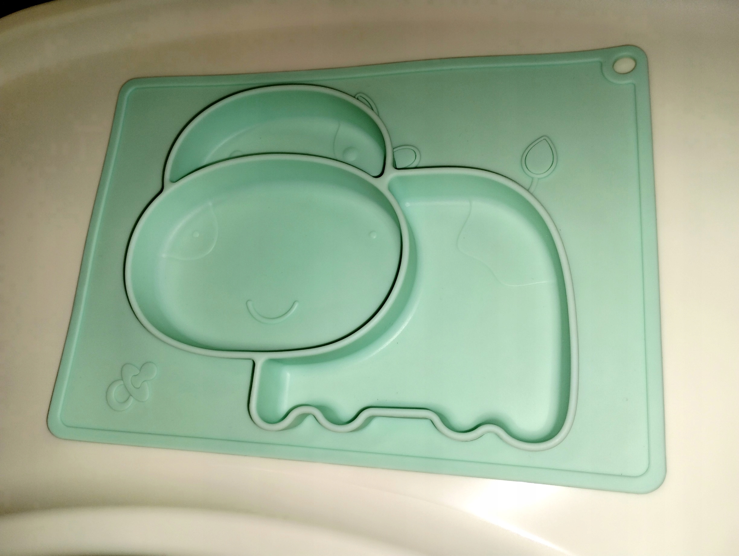 Wykonany jest z całkowicie bezpiecznego dla dzieci silikonu spożywczego. Idealnie przywiera do stołu czy innych powierzchni, więc maluch nie jest w stanie go przesunąć.