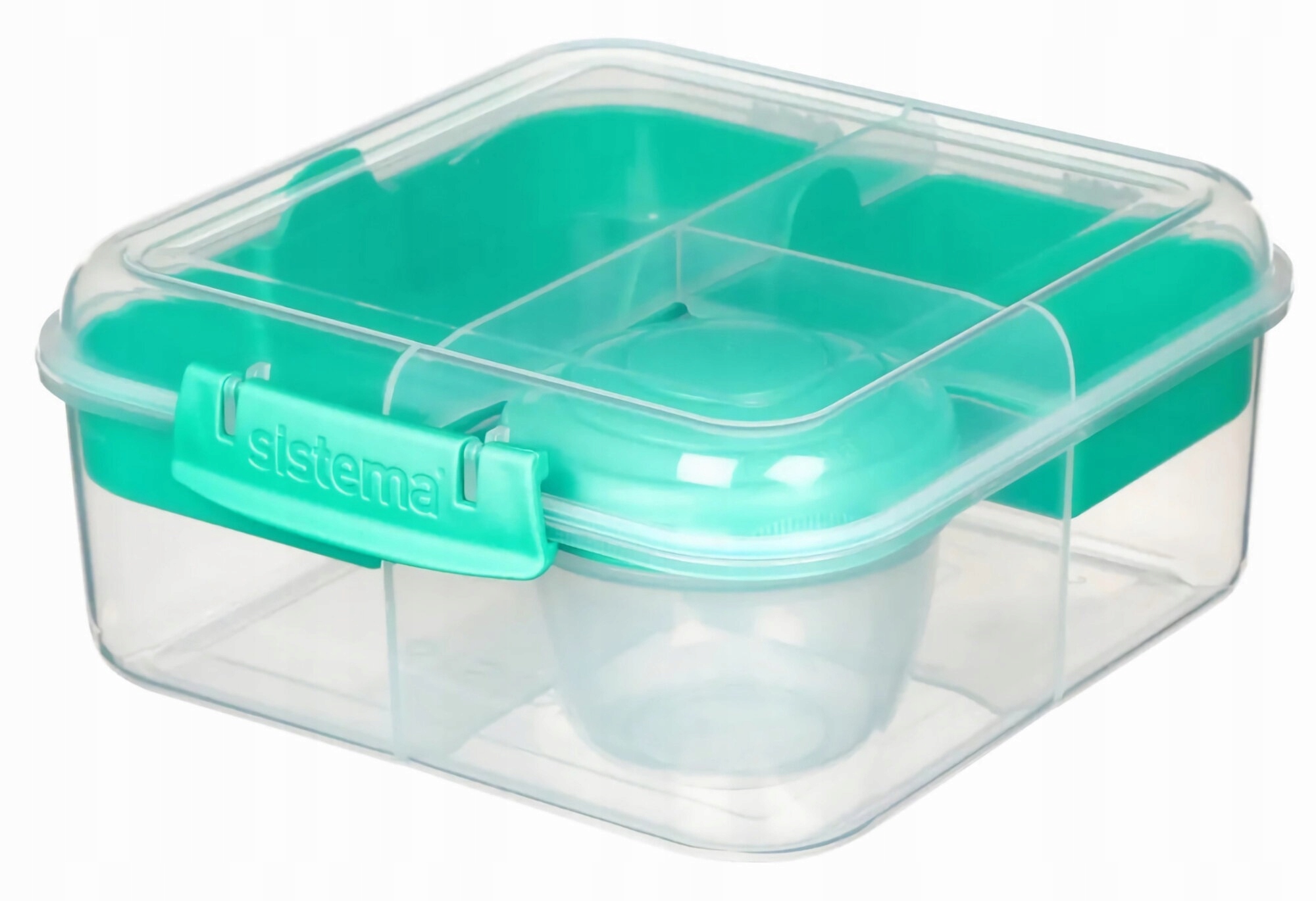 Sistema Bento Cube To Go ma łatwy zatrzask blokujący, wiele wyjmowanych przegródek i pojemnik na jogurt o pojemności 150 ml, dzięki czemu jedzenie jest świeże i oddzielne, aż będzie gotowe do spożycia.
