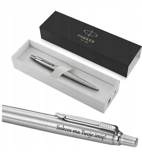 Solidny, klasycznie wykonany długopis Parker z lśniącymi, stalowymi wykończeniami.