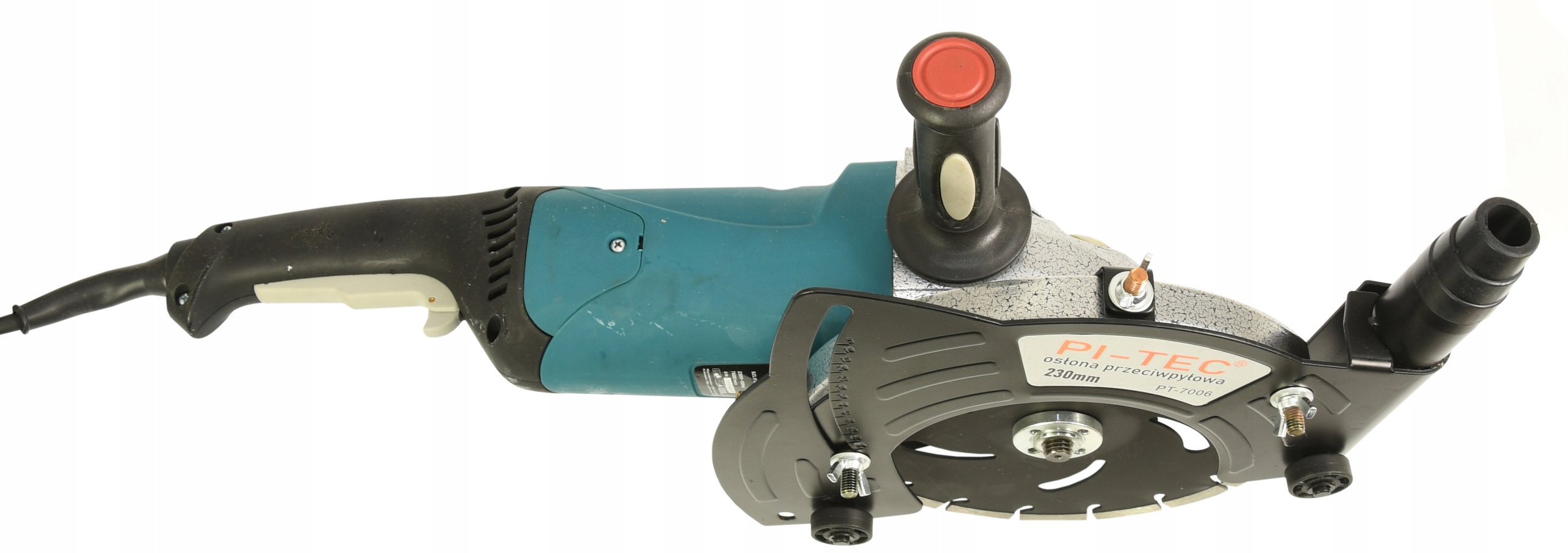 Osłona umożliwia podłączenie odkurzacza przemysłowego umożliwia odsysanie pyłu podczas cięci.