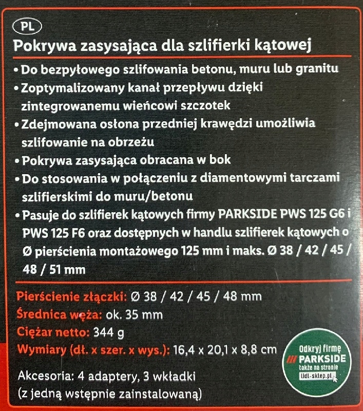 Pasuje do szlifierek kątowych firmy PARKSIDE PWS 125 G6 i PWS 125 F6 oraz dostępnych w handlu szlifierek kątowych o Ø pierścienia montażowego 125 mm i maks. Ø 38/42/45/ 48/51 mm