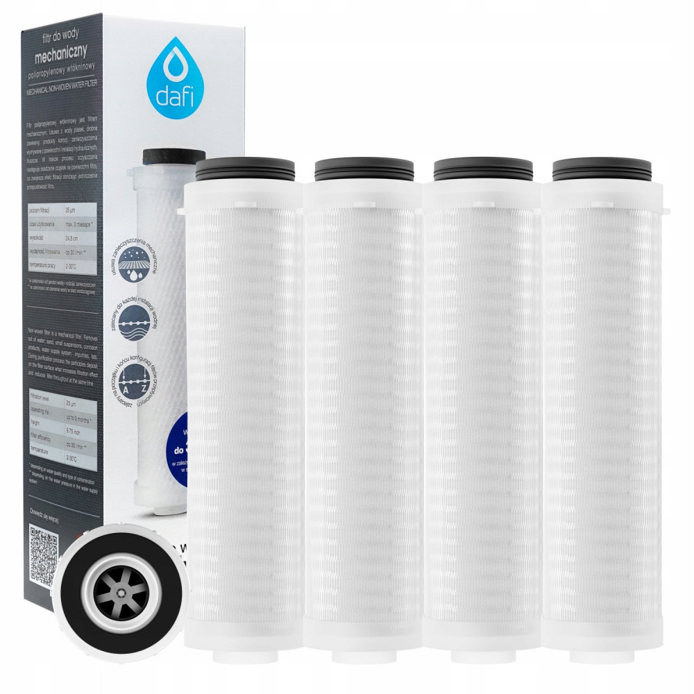 Filtr mechaniczny Dafi przeznaczony do filtracji stałych zanieczyszczeń występujących w instalacji domowej. Wkład jest produktem uniwersalnym.