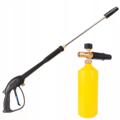 Oferujemy Państwu wysokiej klasy pistolet ciśnieniowy wraz z lanca i dyszą 3-stopniową posiadającą płynną regulację kąta strumienia wody od płaskiego do punktowego oraz możliwość podawania chemii ze zbiornika w maszynie. Ergonomiczna budowa i wysokiej jakości tworzywo sytuują ten pistolet w gronie najwyższej klasy akcesoriów do myjek ciśnieniowych. Oferowany przez nas pistolet jest wysokiej klasy zamiennikiem. Pistolet znajduje szerokie zastosowanie do praktycznie każdego rodzaju myjek ciśnieniowych z klasy hoobby i profesjonal, w których ciśnienie nie przekracza 207Bar, a temperatura wody 60oC. Produkt jest bardzo dobrej jakości wytrzymuje wysokie ciśnienie. Pasuje do myjek firm takich jak KARCHER, MAKITA, KRANZLE oraz do innych myjek wykorzystujących mocowanie na gwint M22 x 1,5mm