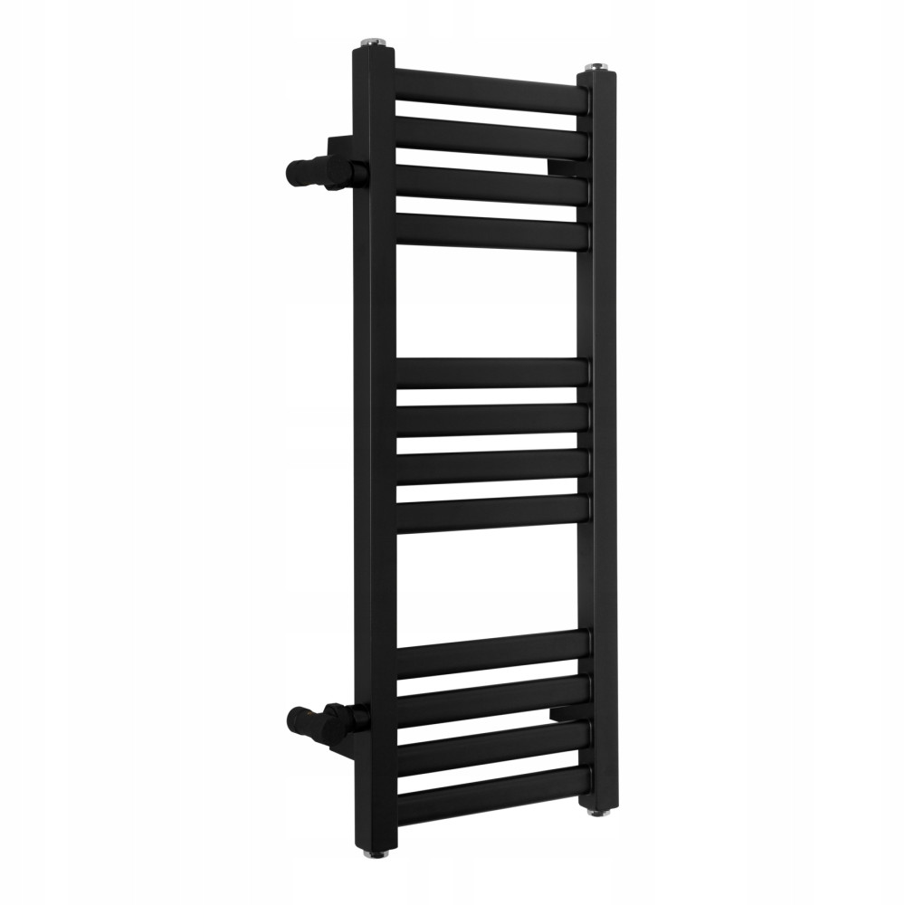 Grzejnik łazienkowy o nowoczesnym kształcie zbudowany z pionowych profili o kwadratowym przekroju i płaskich prostokątnych listew poziomych. Doskonale wkomponuje się we wnętrza współczesnych łazienek. Wersja w kolorze czarnym o wymiarach 73x30cm i mocy 234W z podłączeniem bocznym o rozstawie 50cm  ułożonym symetrycznie na boku grzejnika. Podłączenie jest uniwersalne - lewe/prawe - wystarczy odwrócić grzejnik.