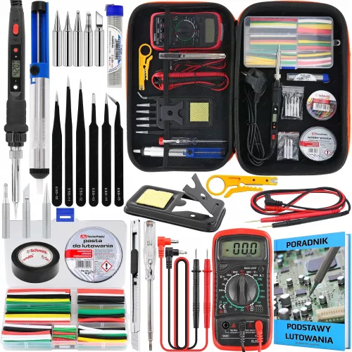 Oto co wyróżnia ten zestaw - mocna firmowa lutownica 80W, miernik cyfrowy, polska cyna Cynela i pasta lutownicza AG TP oraz dobrze dobrany zestaw niezbędnych akcesoriów lutowniczych, zamknięty w praktycznym, pojemnym etui - organizerze.