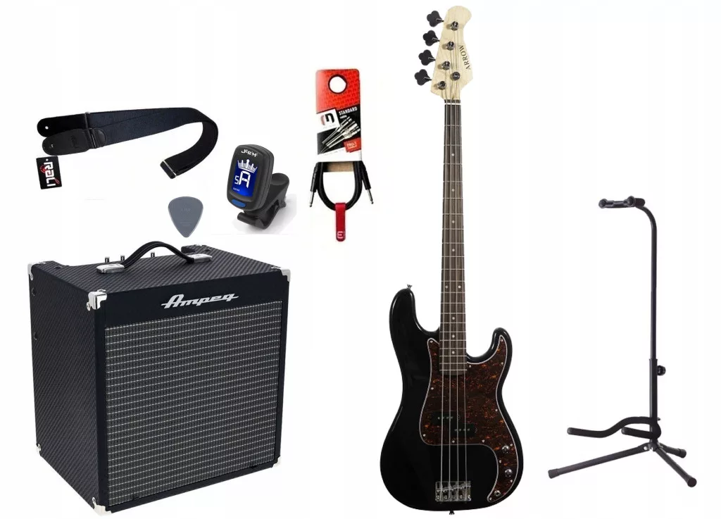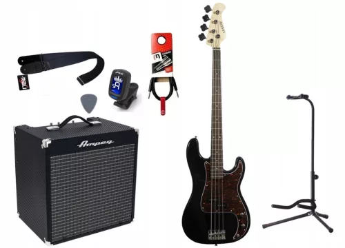 Kompletny zestaw dla basisty, elementy zestawu: 1x Gitara basowa (opis poniżej), 1x Combo basowe 30W (Ampeg RB-108), 1x Kabel gitarowy 3m (Red's Music GC1130BX), 1x Statyw do Gitary (Hamilton Stands KB-303), 1x Tuner gitarowy (Jeremi A9), 1x Pasek do gitary (Rali Nylon70), 1x Kostka gitarowa (Janicek).