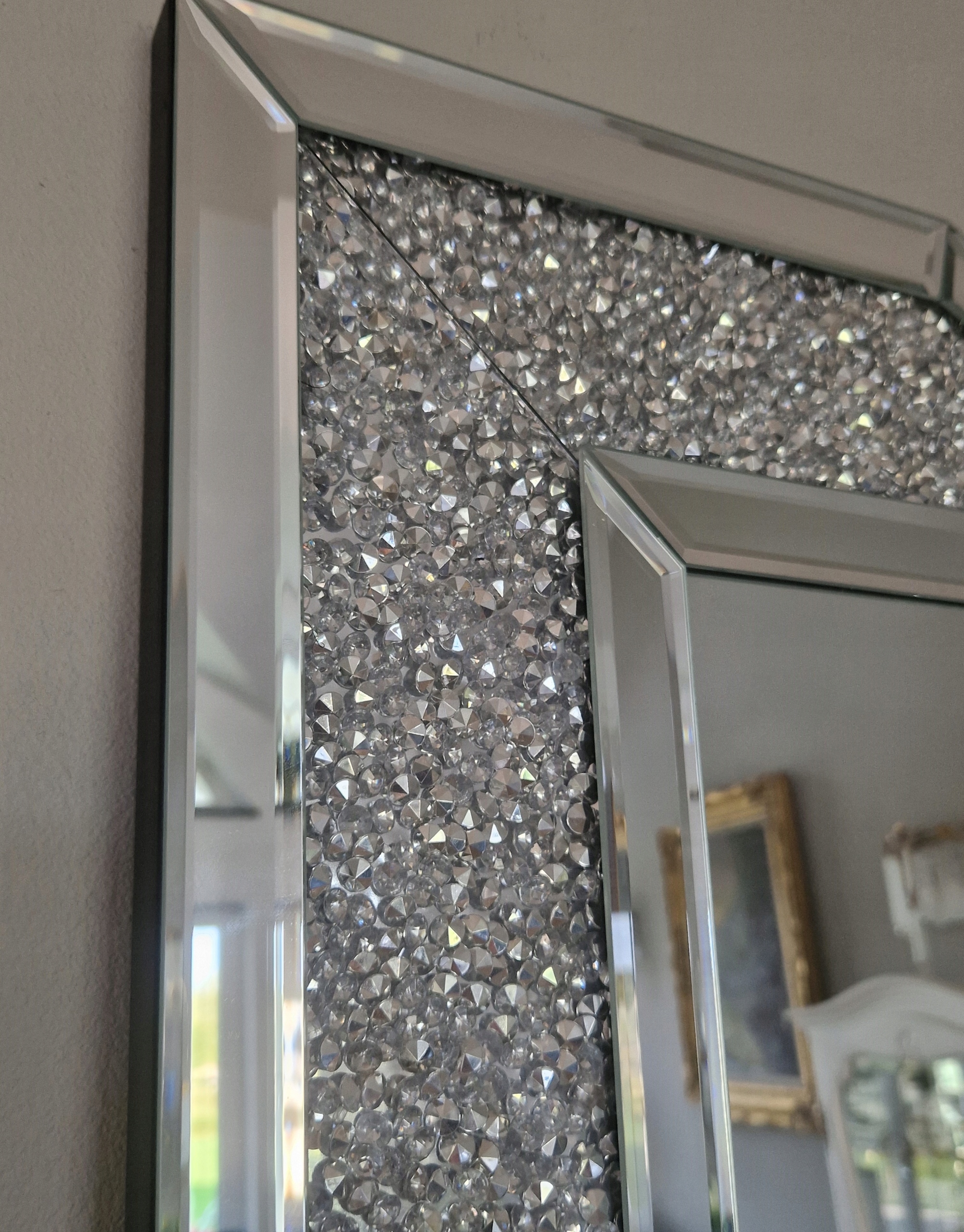 Eleganckie lustro ścienne z efektem błyszczącego kryształu i kruszonych diamentów to doskonały wybór do nadania wnętrzu wyrafinowanego wyglądu. Idealne do wizualnego powiększenia małych pomieszczeń poprzez odbijanie naturalnego światła, natychmiast dodaje stylu i uroku Twojemu domowi. To piękne, prostokątne lustro jest wyjątkową dekoracją, która przyciąga wzrok, stając się centralnym punktem każdego wnętrza . Doskonale sprawdzi się w różnych miejscach: w przedpokoju, nad kominkiem, w jadalni, salonie, sypialni nad łóżkiem czy w łazience nad umywalką, rozświetlając przestrzeń. Lustro wykonane jest z wysokiej jakości szkła o grubości 2,5 cm, co zapewnia odbicie HD bez zniekształceń, a także wzmacnia elegancję Twojego wnętrza.