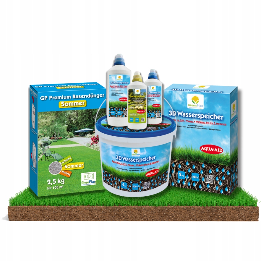 Producent Greenplan zaleca uzupełnienie programu pielęgnacji trawnika Greenplan GP Premium Lato o aplikację produktów z gamy Save Water Greenplan,