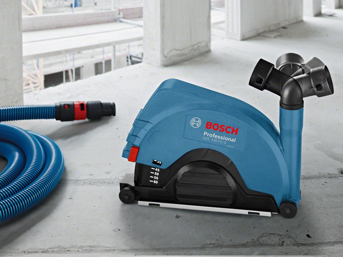 Pokrywa odsysająca GDE 230 FC-S marki Bosch zapewnia praktycznie bezpyłową pracę ze szlifierkami kątowymi typu GWS o średnicy tarczy tnącej 230 mm z osłonami na mocowanie zaciskowe przy pomocy klucza.