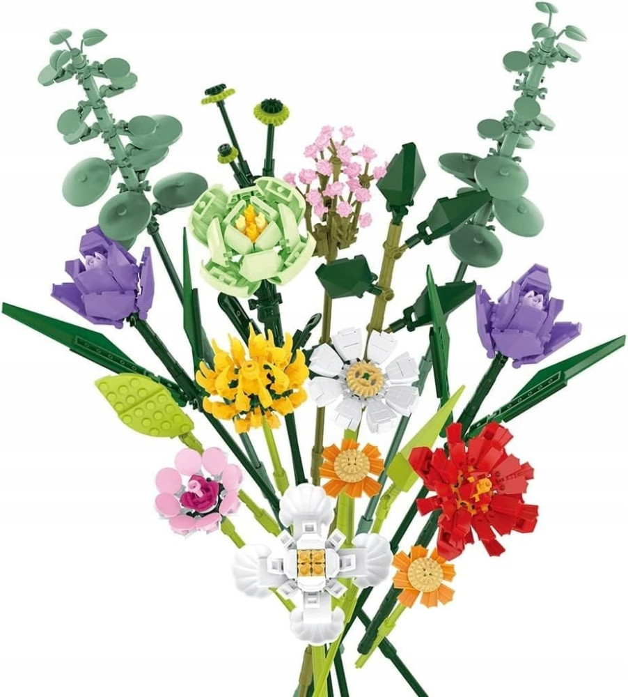 Bukiety kwiatów zawierają regulowane łodygi, dzięki czemu możesz wykazać się kreatywnością podczas aranżacji własnych, wyjątkowych dekoracji kwiatowych. Regulowany drążek ułatwia dopasowanie rozmieszczenia każdego wazonu lub pojemnika. Każdy szczegół bukietu składa się z cegieł, które można wykorzystać do stworzenia wyjątkowego wyświetlacza.