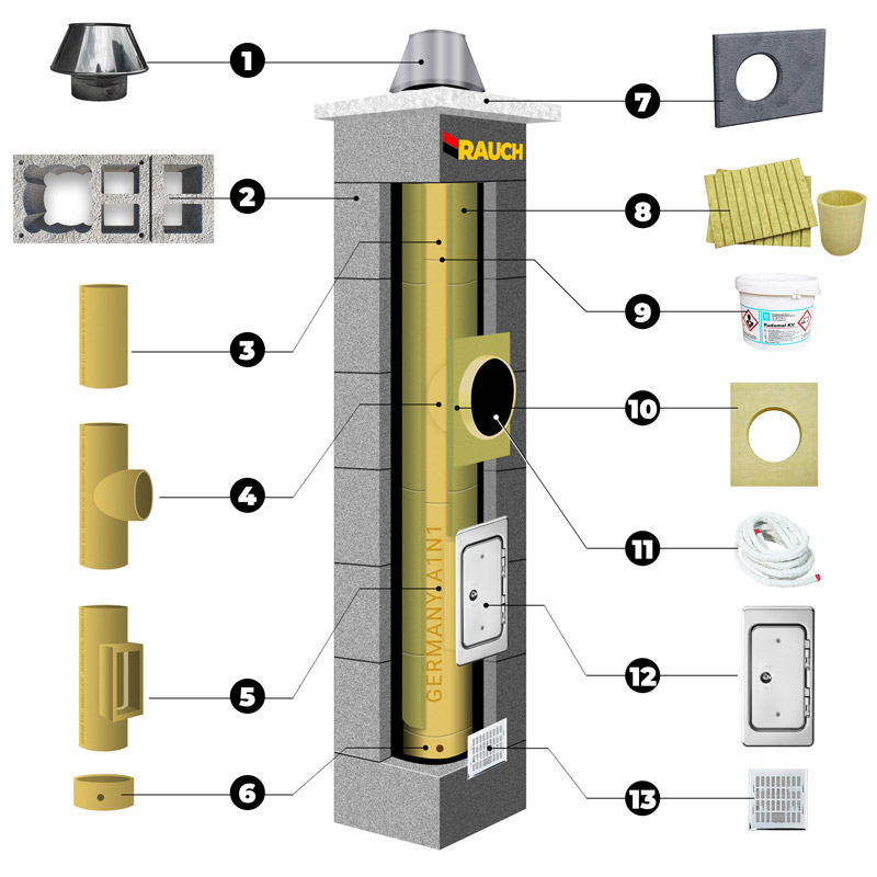 Montaż systemu RAUCH UNIWERSAL może być zarówno na zewnątrz jak i wewnątrz budynku. W systemie tym zostały zastosowane najwyższej jakości żaroodporne niemieckie wkłady ceramiczne, odpowiadające wymaganiom normy EN 1457-1, EN 1457-2, które zapewniają możliwość odprowadzenia spalin do 600°C (klasa T600), są one odporne na pożar sadzy do 1000°C. Każdy element oznaczony jest normą A1N1.